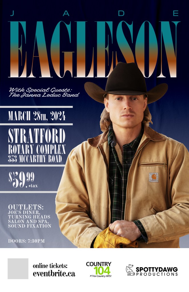 Spottydawg Productions and Country 104 are proud to announce that the 2023 CCMA Male Artist AND Entertainer of the Year Award winner is coming to do his thing in Stratford, Ontario at the Stratford Rotary Complex. We are selling a very limited amount of VIP tickets for $79.99 plus tax ($90.39 total) which includes a photo meet and greet with Jade as well as side stage seating with a dedicated cash bar. General Admission Tickets are $59.99 plus tax ($67.79 total) and are also limited. This event will sell out fast.