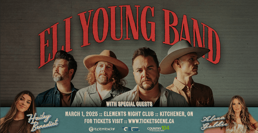 Eli Young Band at Elements Kitchener Where Elements , 90 King St W, Kitchener, ON, N2G 1A6 Map When Feb 26/25 12:00 AM - Feb 26/25 12:00 AM Age All ELI YOUNG BAND w/ special guests Hailey Benedict and Alexa Goldie Saturday, March 1st, 2025 Elements Kitchener TICKETS ON SALE NOW