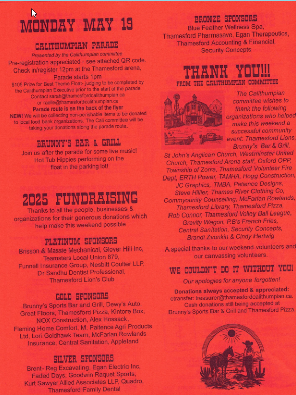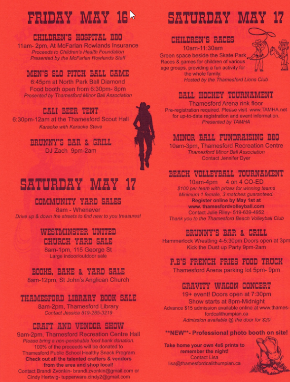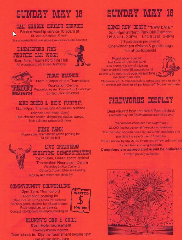 Thamesford Calithumpian is a community-wide celebration that takes place annually on the May Long weekend in Thamesford, Ontario! The annual four-day event features live music, fireworks, a beer tent, a number of family-friendly events, a community parade, and a lot of fun and laughter.
