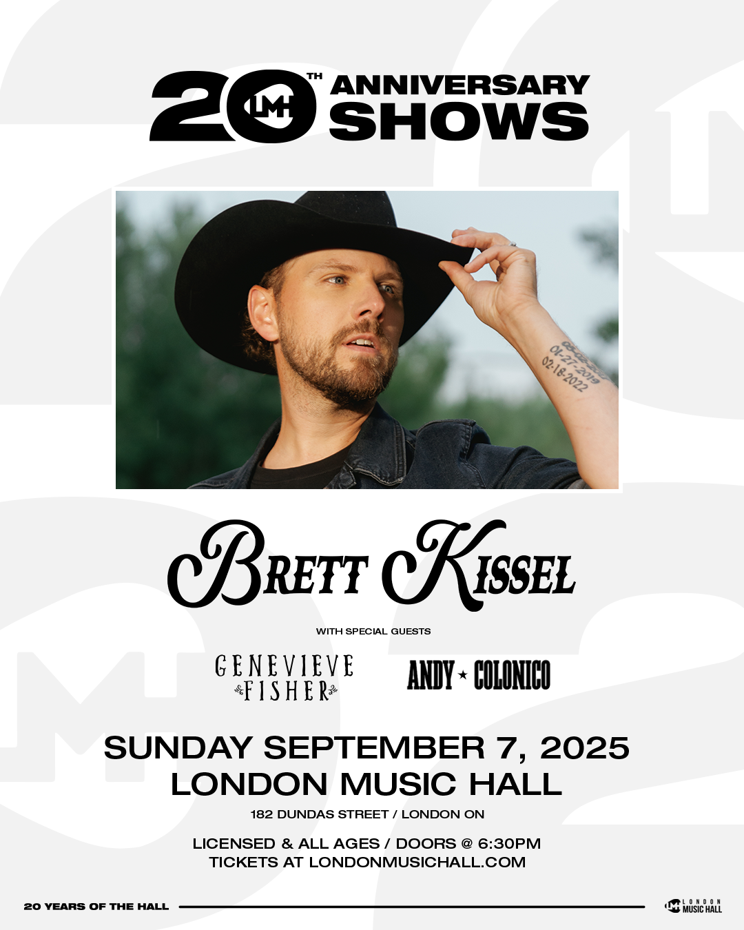 Brett Kissel at London Music Hall Where London Music Hall, 185 Queens Ave, London, ON, N6A 1G7 Map When Sep 07/25 07:00 PM - Sep 07/25 11:00 PM Age All Website https://www.ticketmaster.ca/event/100062D0D389328E BRETT KISSEL w/ special guests Genevieve Fisher and Andy Colonico Sunday, September 7th, 2025 London Music Hall TICKETS GO ON SALE FRIDAY, JUNE 20TH @ 10 AM LOCAL