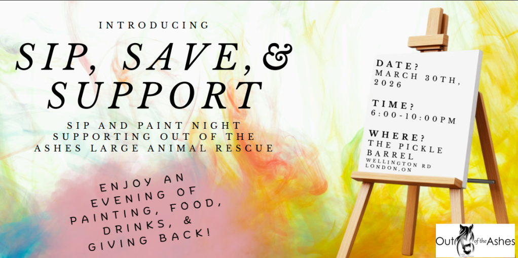 A fundraising Sip & Paint in support of Out of the Ashes Large Animal Rescue hosted by Audrey Phillips, Carley Byfield and Hayley Skipper who are currently students in the Event Planning Program at Fanshawe College. The night is filled with a spring themed painting lesson and all the supplies you’ll need, provided appetizers, a small silent auction and a chance to learn about the neglect and abuse these large animals face.