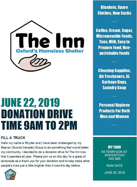See poster image for more details on how to support Rhyder & his Beaver (Scouts Canada) Group in their quest to Fill A Truck for The Inn – Oxford County’s Homeless Shelter this Saturday.