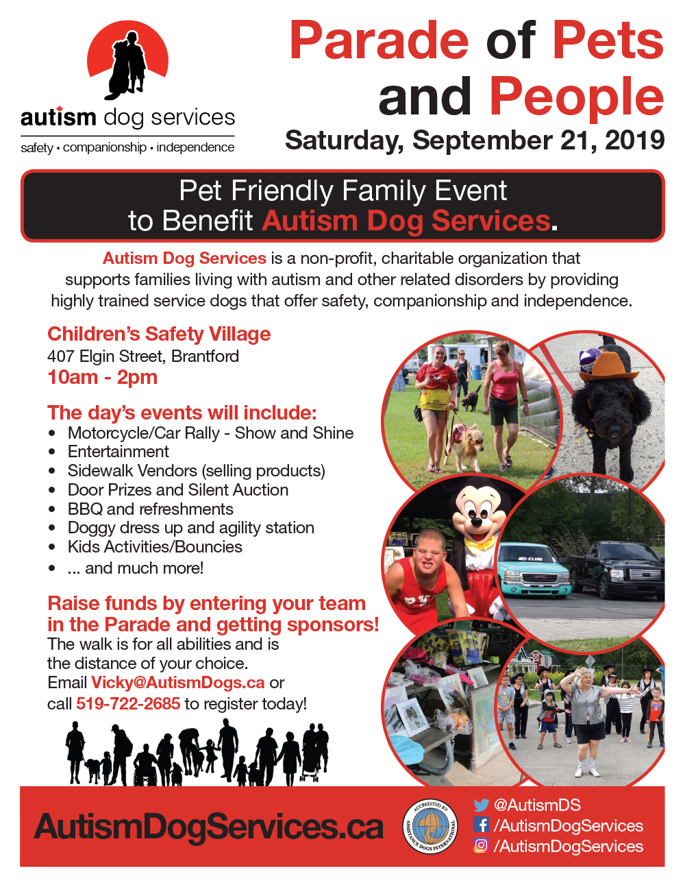 A Parade of Pets and People is a walk geared to a distance of choice for the participants. It is a family friendly event that encourages participants to collect pledges to raise funds for the organization. It is an annual fundraising event that supports Autism Dog Services Inc., a registered Canadian charity, operating since 2010 that supports families affected by autism or other related disorders. Expertly trained service dogs are placed with these children/families and offer safety, independence and companionship. As well as the walk, there will be a BBQ lunch, a silent auction/raffle, a car show and motorcycle rally as well as visits from Brantford Police, Fire and Paramedics.