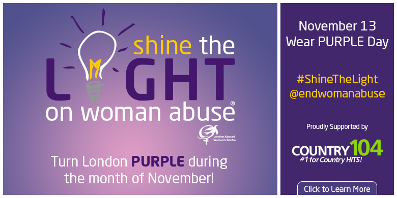 The goals of the Shine the Light on Woman Abuse campaign are to raise awareness of men’s violence against women by turning communities purple for the month of November. Purple is a symbol of courage, survival and honour, and has come to symbolize the fight to end woman abuse.