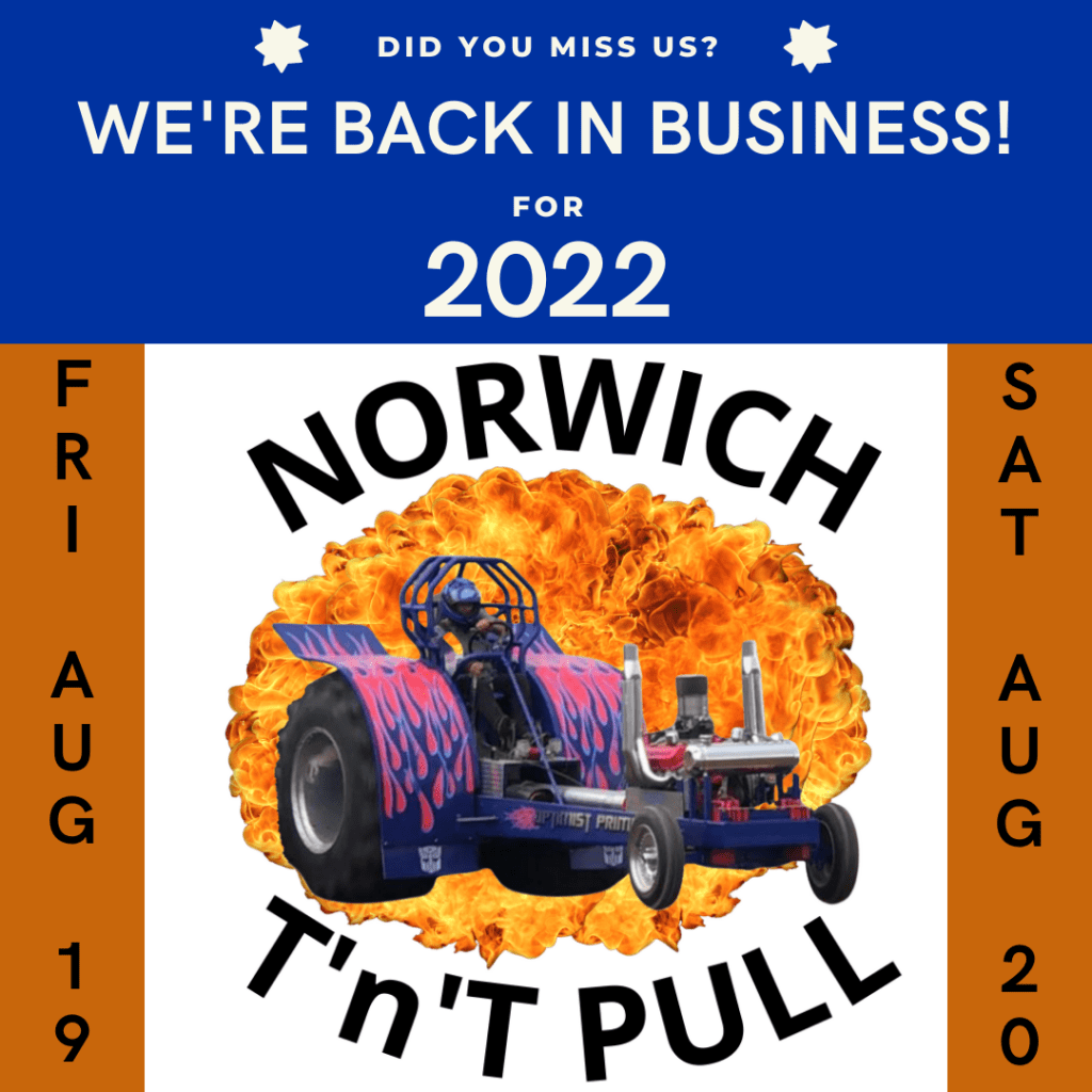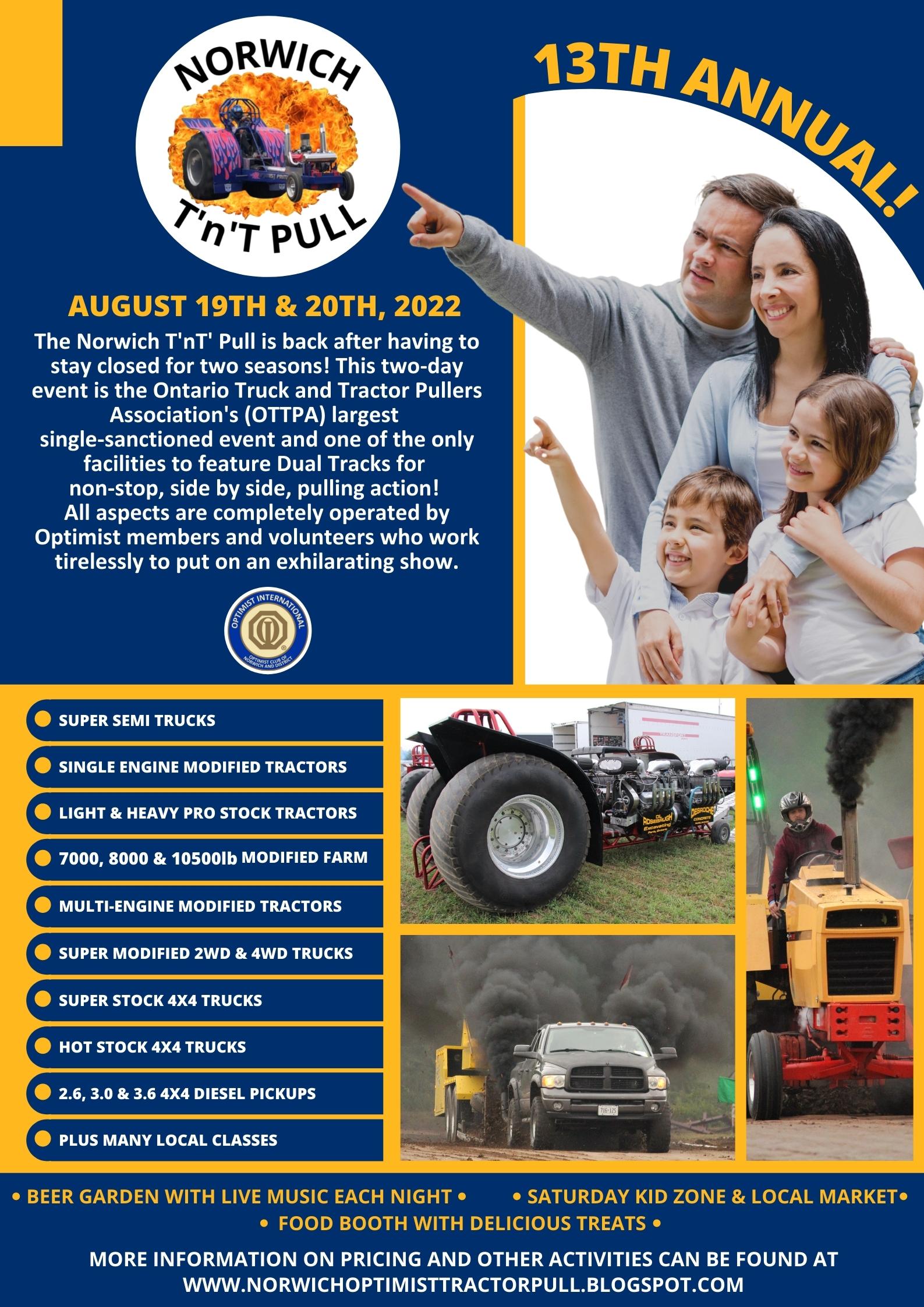 Norwich Truck N’ Tractor Pull 2022 Where 365701 Evergreen St., Norwich, ON, N0J 1P0, Canada Map When Aug 19/22 12:00 AM - Aug 20/22 12:00 AM Age All Website https://www.facebook.com/norwichtntpull/
