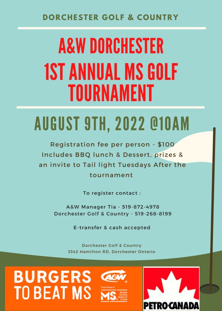 A&W Dorchester – 1st Annual MS Golf Tournament Where Dorchester Golf & Country Club, Dorchester, ON Map When Aug 09/22 10:00 AM - Aug 09/22 06:00 PM Age All