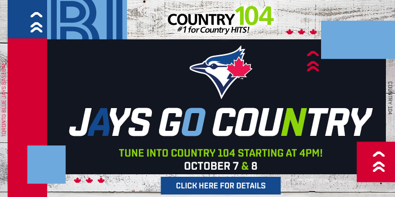 Jays Go Country Where Rogers Centre, Toronto, ON, Canada Map When Oct 07/22 04:00 PM - Oct 08/22 04:00 PM Age All Website country104.com/player GAME DAY ON COUNTRY 104 LISTEN LIVE! 103.9 ON YOUR DIAL FRI OCT 7 | 4PM AL Wild Card: Toronto Blue Jays vs. Seattle Mariners – Game 1 Rogers Centre – Toronto, ON & SAT OCT 8 | 4PM AL Wild Card: Toronto Blue Jays vs. Seattle Mariners – Game 2 Rogers Centre – Toronto, ON