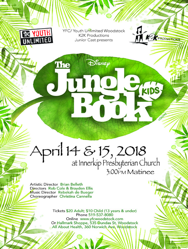 YFC/Youth Unlimited Woodstock’s K2K Productions Junior Cast Presents Disney’s The Jungle Book Kids Where Innerkip Presbyterian Church Map When Apr 14/18 03:00 PM - Apr 15/18 05:00 PM Age All Price Starting at $Adults- $20 / Students- $10 (13& under) Website http://yfcwoodstock.com/